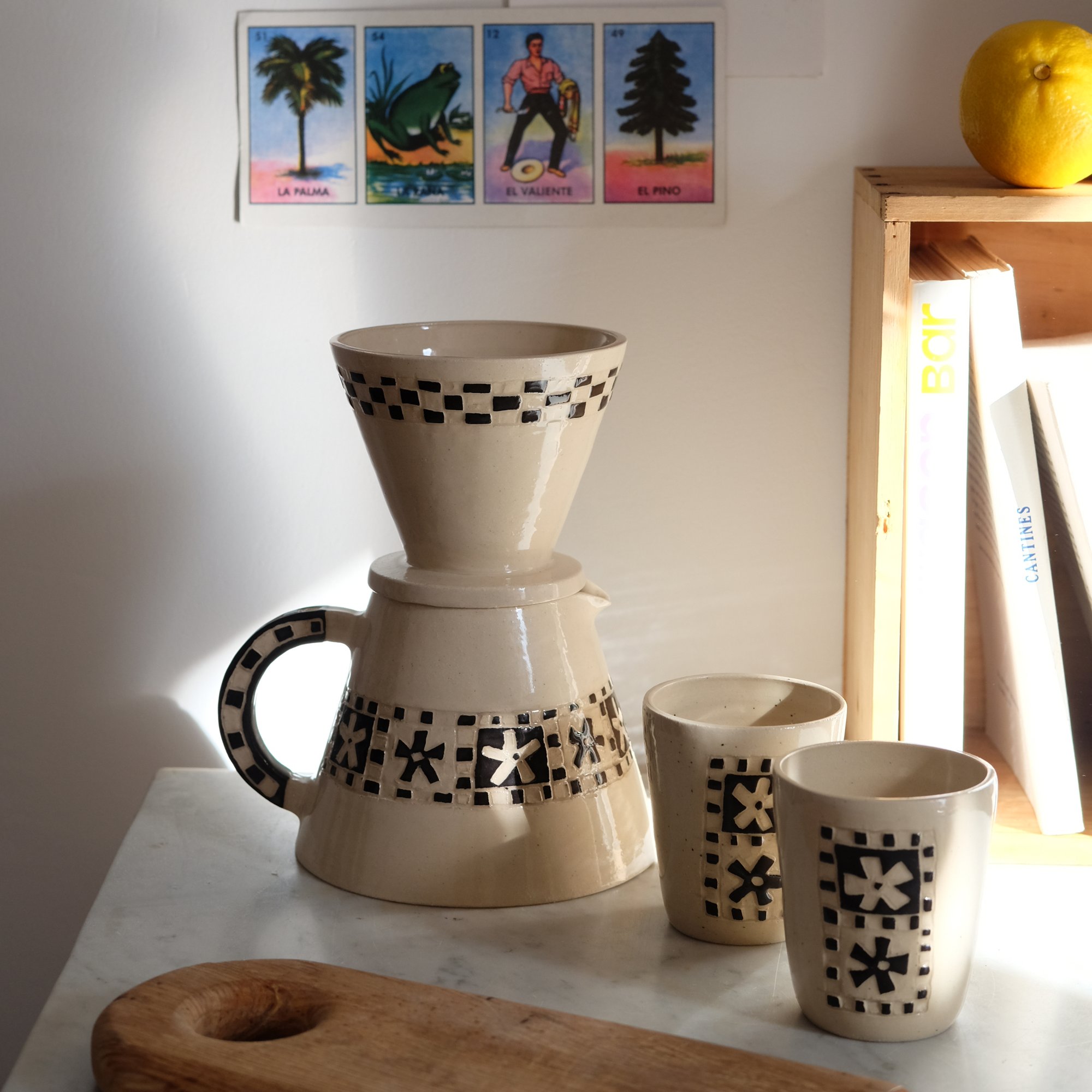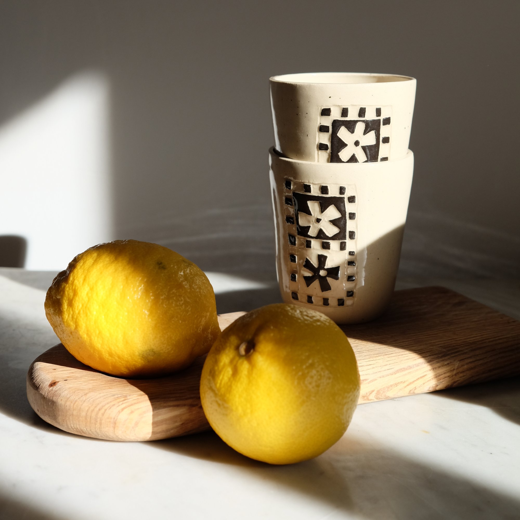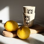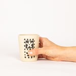 Cette méthode consiste à appliquer une couche d'engobe sur une pièce à le gratter pour créer un motif. Toutes ces pièces sont uniques et le motif peut donc légèrement varier d'un gobelet à l'autre.
